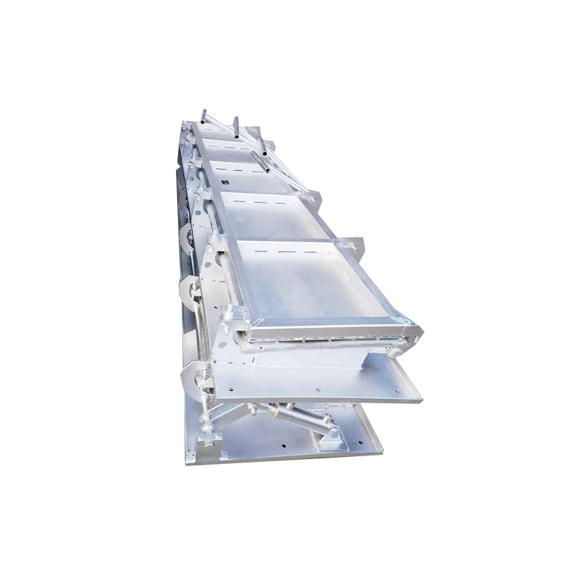工作流程:將雨水調(diào)蓄池分割成數(shù)條長形沖洗廊道,廊道始端設(shè)置存水池和沖洗門,廊道末端設(shè)置集水坑。在調(diào)蓄池空池狀況,池內(nèi)無水,沖洗門門體呈松池開啟狀態(tài)。在暴雨中,雨水流入調(diào)蓄池,調(diào)蓄池及存水池內(nèi)水位將上升,池內(nèi)水位上升到設(shè)定值時,沖洗門通過池內(nèi)液位計開關(guān)信號控制而關(guān)閉。在雨水調(diào)蓄池排空時,池底將留有爛泥、殘渣、碎片等固體沉積物。當(dāng)集水坑水位降低至設(shè)定值時,沖洗門通過池內(nèi)液位計開關(guān)信號控制而打開,瞬間將存水池、蓄水池內(nèi)的水釋放,沖洗門底部噴射出具有強力的、沖浪式的射流。射流形成的波浪將池底的沉積物卷起,沖流到雨水調(diào)蓄池末端的集水坑,通過排污泵排出。沖洗結(jié)束后,沖洗門在阻尼器的作用下依靠自重緩緩關(guān)閉,至下一次循環(huán)使用。